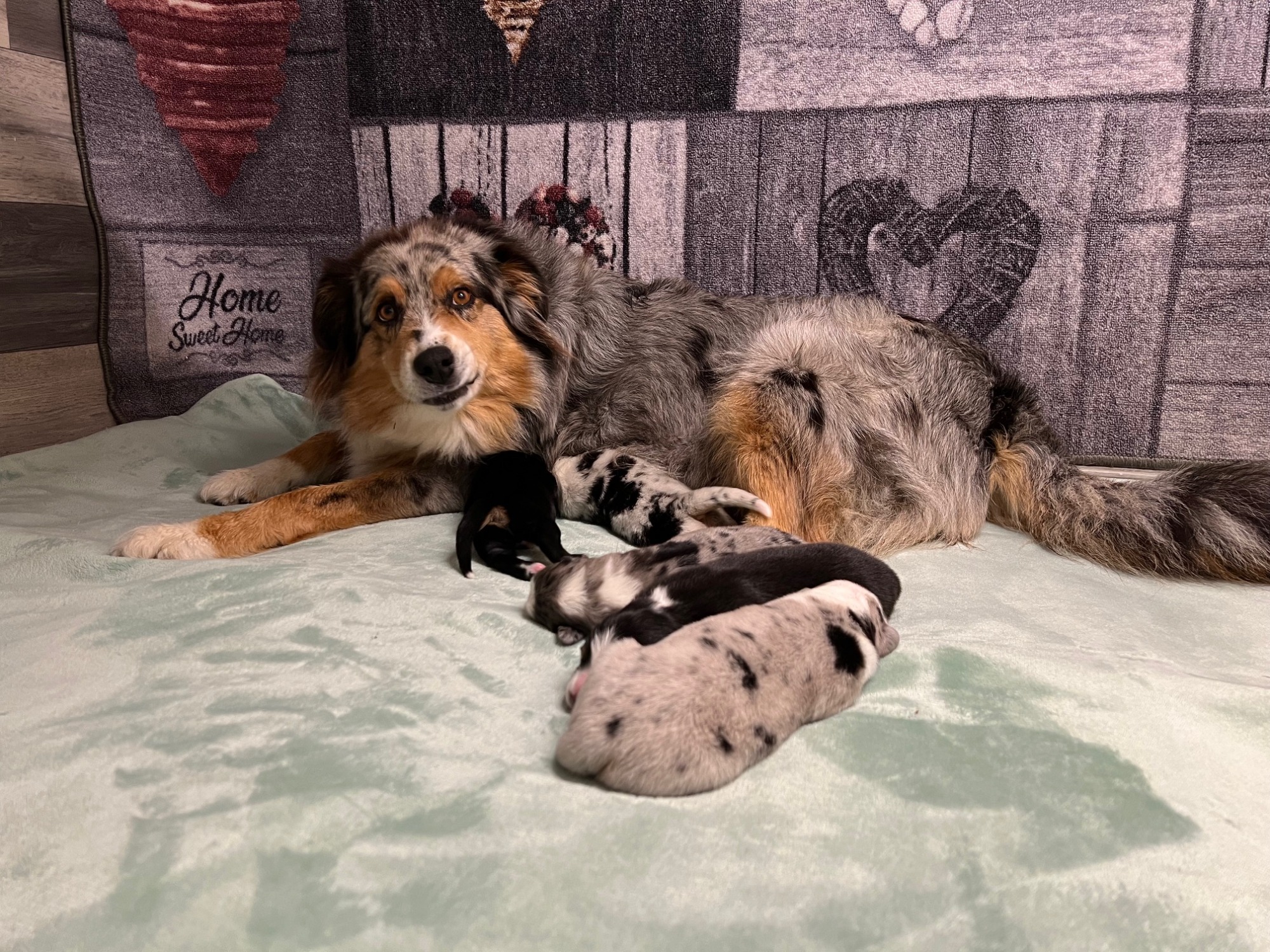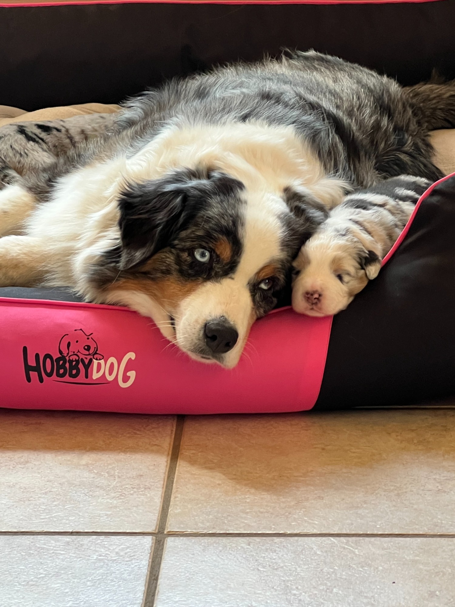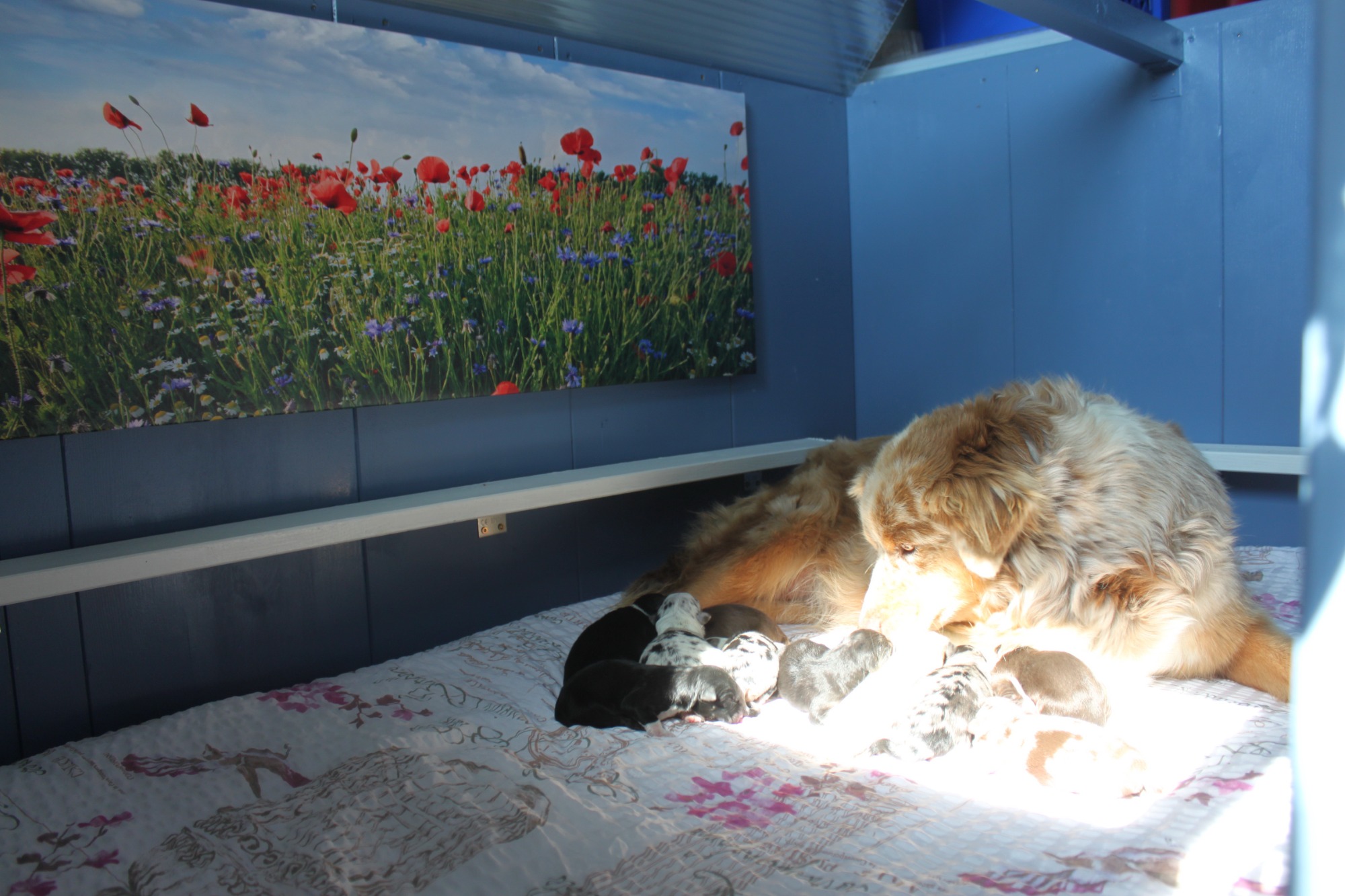 Die ersten Tage beginnen ganz nah bei uns – im Wohnzimmer. Hier kommen die Kleinen zur Welt und werden von Anfang an rund um die Uhr umsorgt. In einer gemütlichen Welpenbox finden sie Wärme, Geborgenheit und die Nähe, die sie in dieser sensiblen Zeit brauchen.